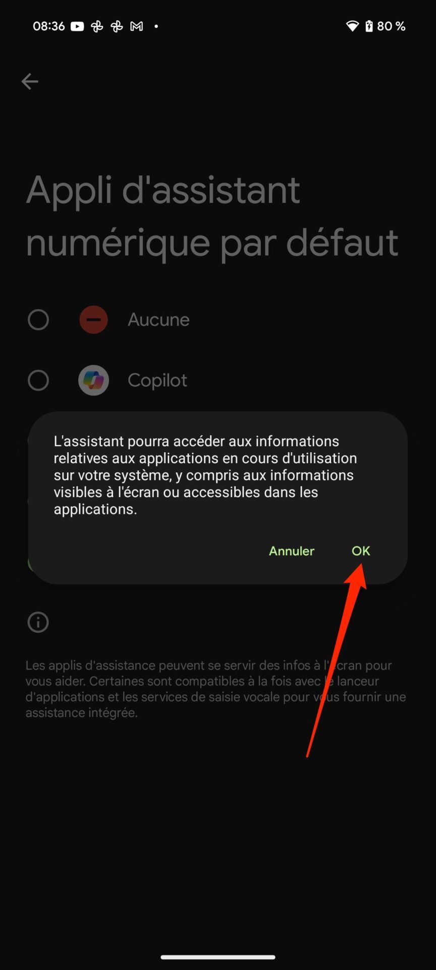 Rendez-vous à présent dans les Paramètres de votre smartphone Android. Accédez au menu Applications puis dans la section Applis par défaut, entrez dans le menu Appli d’assistant numérique. Sélectionnez ensuite Appli d’assistant numérique par défaut, et choisissez Copilot. Un pop-up indiquant que l’assistant pourra accéder à certaines informations relatives aux applications en cours d’utilisation sur votre appareil devrait alors s’afficher. Appuyez sur le bouton OK pour valider.