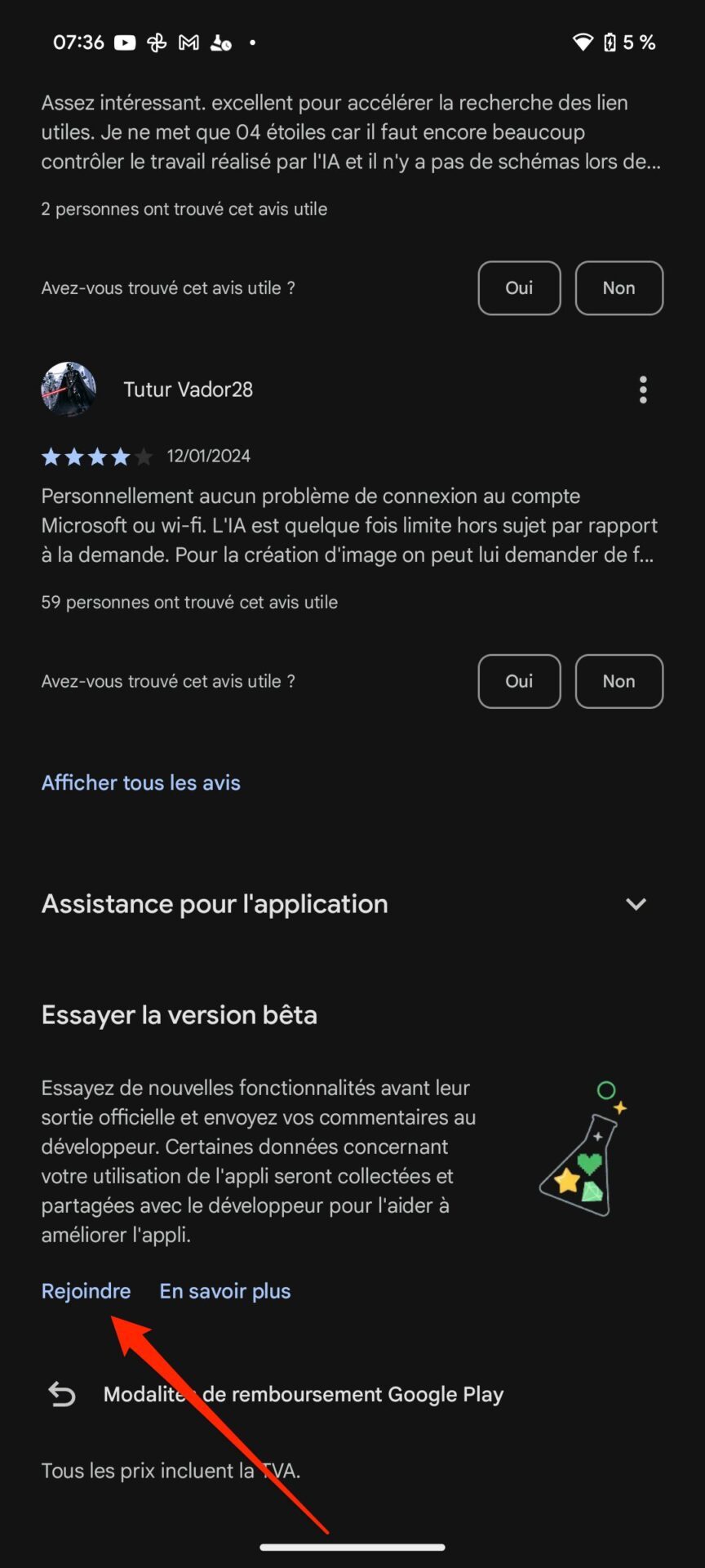 Pour rejoindre le programme bêta de Microsoft Copilot, rendez-vous tout en bas de la fiche de téléchargement de l’application sur le Google Play Store. Sous l’intitulé Essayer la version bêta, appuyez sur Rejoindre. Un pop-up Participer au programme bêta devrait alors s’ouvrir. Appuyez sur Participer pour valider votre inscription au programme bêta de l’application.