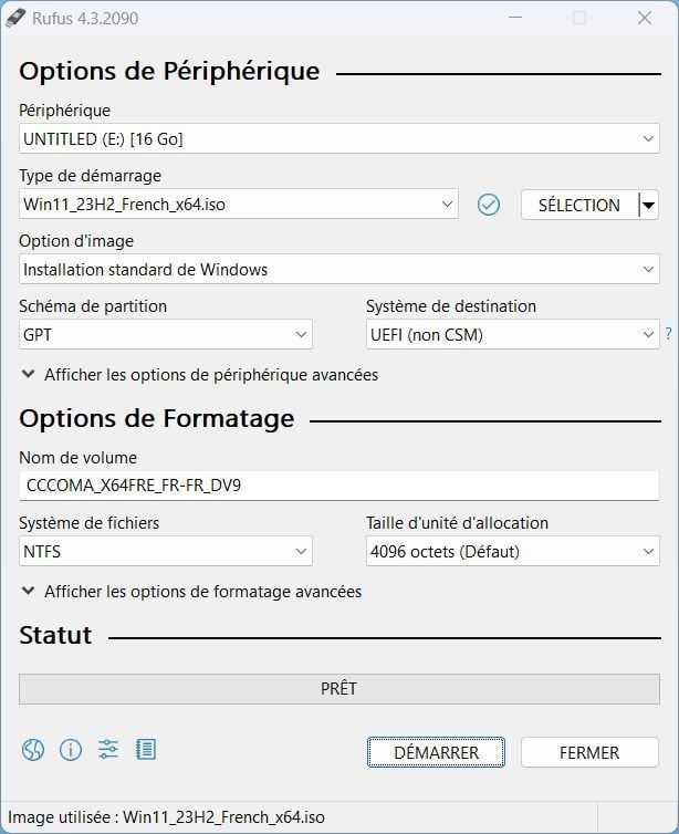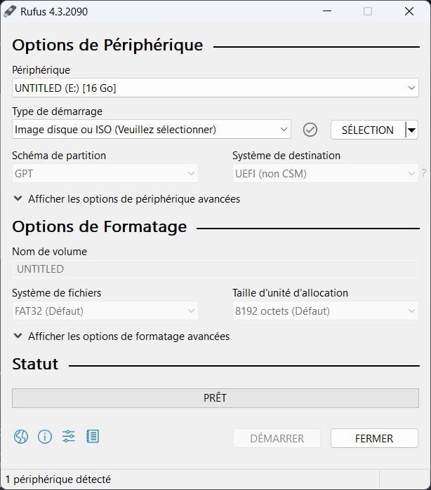Connectez ensuite votre clé USB à votre PC et ouvrez désormais Rufus. Logiquement, l’utilitaire devrait détecter automatiquement votre clé USB et la sélectionner dans le menu déroulant affiché sous l’intitulé Périphérique. Cliquez ensuite sur le bouton Sélection, puis choisissez l’image disque au format ISO de Windows 11 23H2 que vous avez téléchargé précédemment.