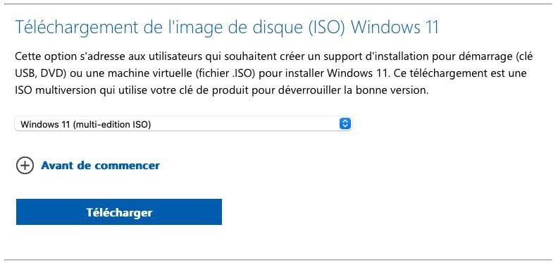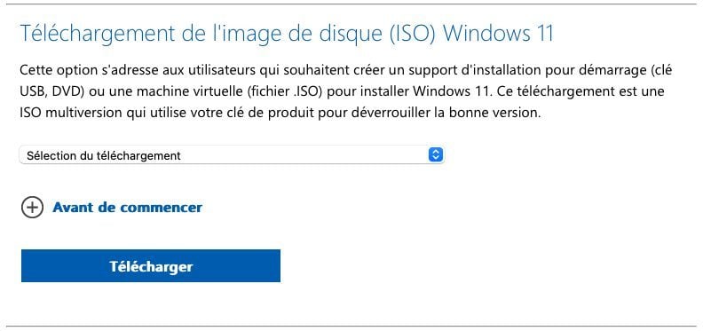 Ouvrez votre navigateur favori, et rendez-vous sur la page de téléchargement de l’image disque ISO de Windows 11 23H2. Sous l’intitulé Téléchargement de l’image disque (ISO) Windows 11, cliquez sur le menu déroulant Sélection du téléchargement, et choisissez Windows 11 (multi-edition ISO). Cliquez ensuite sur le bouton Télécharger.