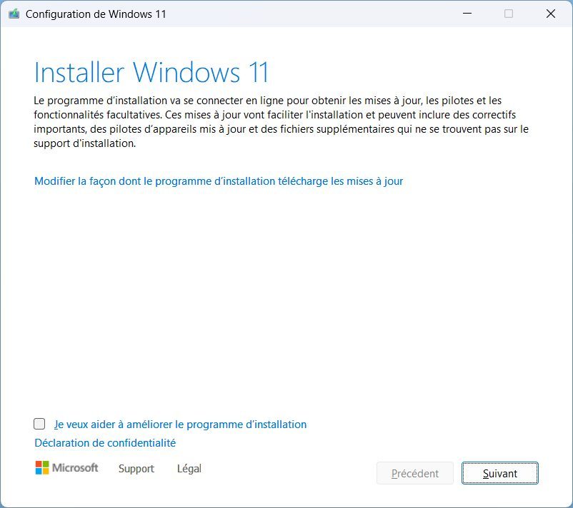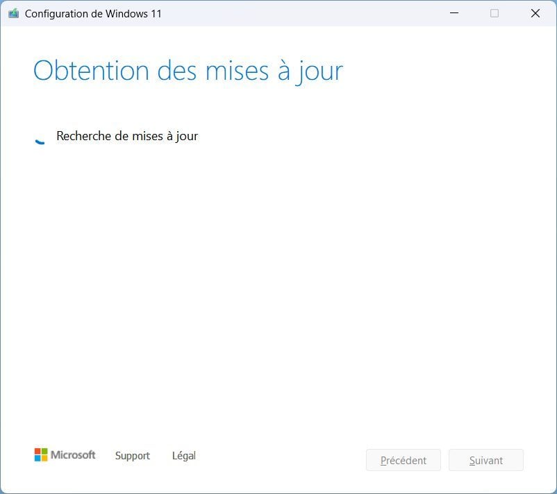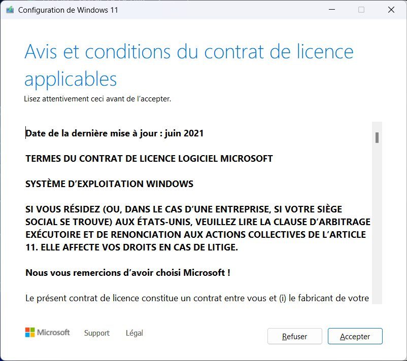 Dans la fenêtre Installer Windows 11, cliquez sur le bouton Suivant. L’assistant d’installation va alors rechercher la disponibilité de mises à jour, mais va très rapidement sauter la vérification du matériel pour afficher le contrat de licence de Windows 11. Cliquez alors sur Accepter.