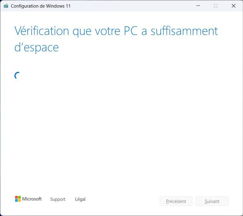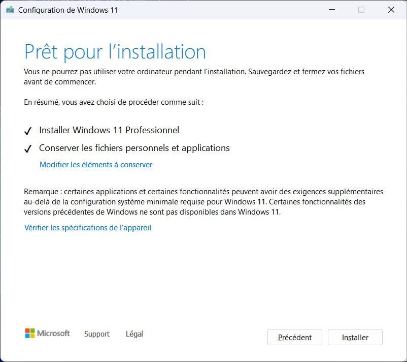 Patientez ensuite quelques instants. L’assistant d’installation va ensuite vérifier que votre PC dispose de suffisamment d’espace pour l’installation de la mise à jour avant d’afficher une fenêtre Prêt pour l’installation. Cliquez alors sur le bouton Installer pour lancer l’installation de Windows 11 23H2 sur votre PC.